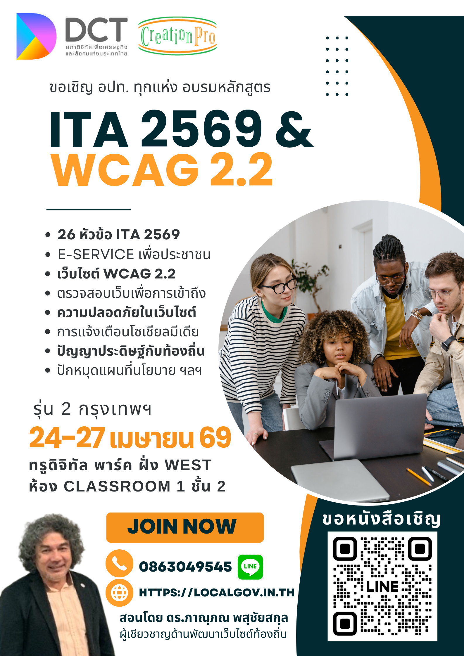 ขอเชิญ องค์กรปกครองส่วนท้องถิ่นทุกท่าน อบรมเชิงปฏิบัติการในหัวข้อ “เว็บไซต์มาตรฐานตามหัวข้อ ITA 2569 พร้อมแนวทางการพัฒนาเว็บไซต์ เพื่อการเข้าถึงโดยสะดวกถ้วนหน้า WCAG 2.2” องค์กรปกครองส่วนท้องถิ่น ประจำปีงบประมาณ 2569 โดยความร่วมมือของ สภาดิจิทัลเพื่อเศรษฐกิจและสังคมแห่งประเทศไทย ระหว่างวันที่ 24-27 เมษายน พ.ศ. 2569 จำนวน 4 วัน ตั้งแต่เวลา 8.30 – 16.30 น. ณ ทรูดิจิทัล พาร์ค ฝั่ง West ห้อง Classroom ๑ ชั้น ๒ กรุงเทพฯ (รถไฟฟ้า BTS สายสีเขียว สถานีปุณณวิถี) ขอหนังสือเชิญ 0863049545 แอดไลน์ได้