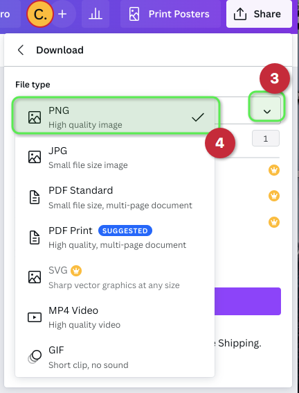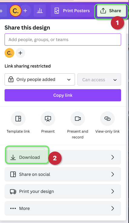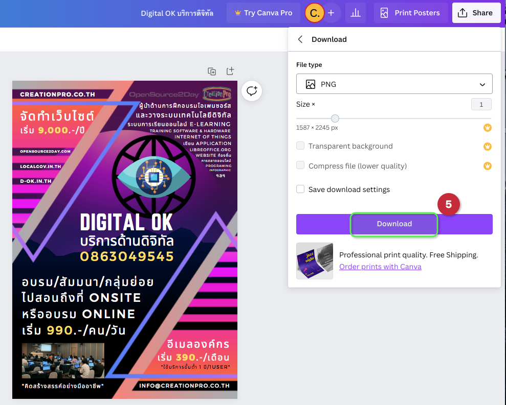 10. เมื่อ Poster เป็นที่ต้องการแล้ว ให้ไปที่ทุมบนขวามือของ canva.com จะพบปุ่ม Share เมื่อคลิกแล้วจะพบ Download