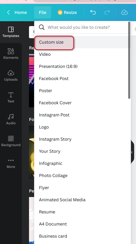 12. เลือกรูปแบบที่ท่านต้องการออกแบบ กรณีนี้เลือกแบบกำหนดเอง Custom size