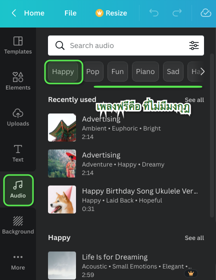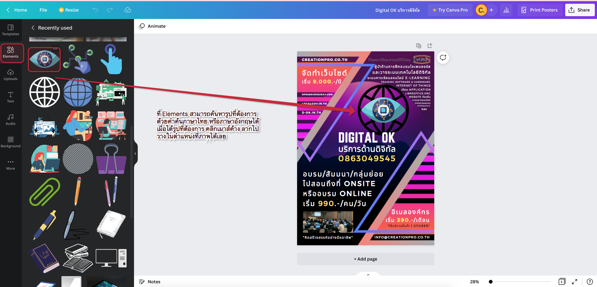 5. ที่ Elements สามารถค้นหารูปที่ต้องการด้วยคำค้นภาษาไทย หรือภาษาอังกฤษได้ เมื่อได้รูปที่ต้องการ คลิกเมาส์ค้าง ลากไปวางในตำแหน่งที่ภาพได้เลย