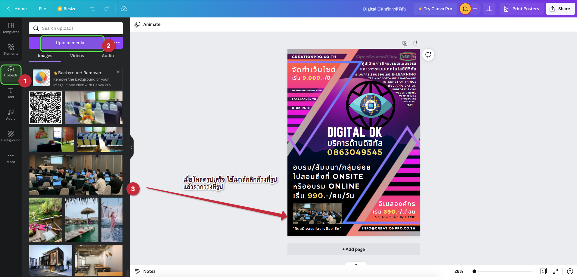 6. ที่ Uploads สามารถอัพโหลดรูปจากช่องทางอื่นเข้ามาใน canva ได้ โดยคลิกที่ Upload media เมื่อโหลดรูปเสร็จ ใช้เมาส์คลิกค้างที่รูป แล้วลากวางที่ภาพ