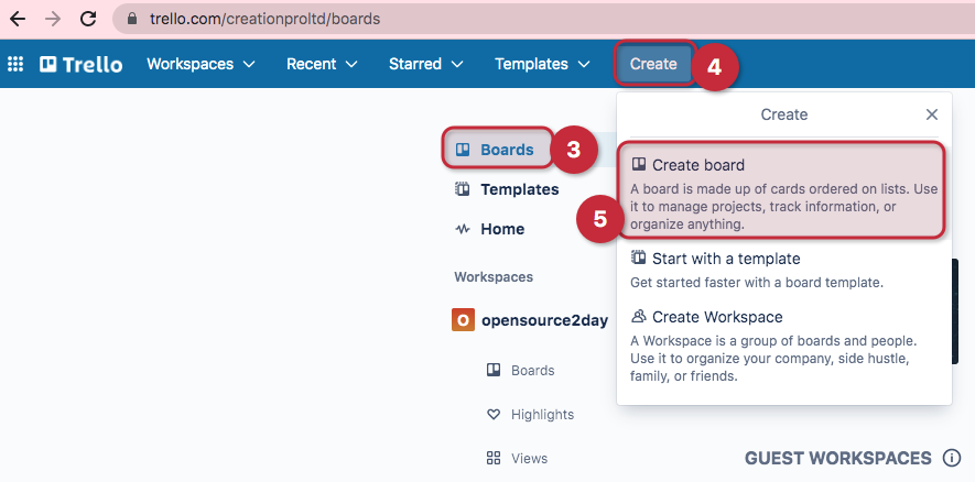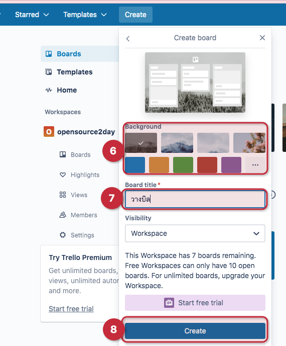 2. เมื่อเข้ามาที่ระบบแล้ว จะเริ่มสร้างภาระงานหน้าที่ โดยคลิกที่ Boards ตามด้วย Create และ Create broad ตามลำดับ