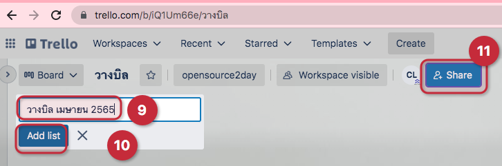 4. เมื่อเข้ามาใน Broad แล้ว เริ่มสร้างภาระงานตามหัวข้อ Add list หรือดีไซน์ได้ตามแนวทางที่ต้องการ หากต้องการแชร์ให้บุคคลอื่นที่ใช้ Trello มาช่วยงานนี้ ให้คลิกที่ปุ่ม Share
