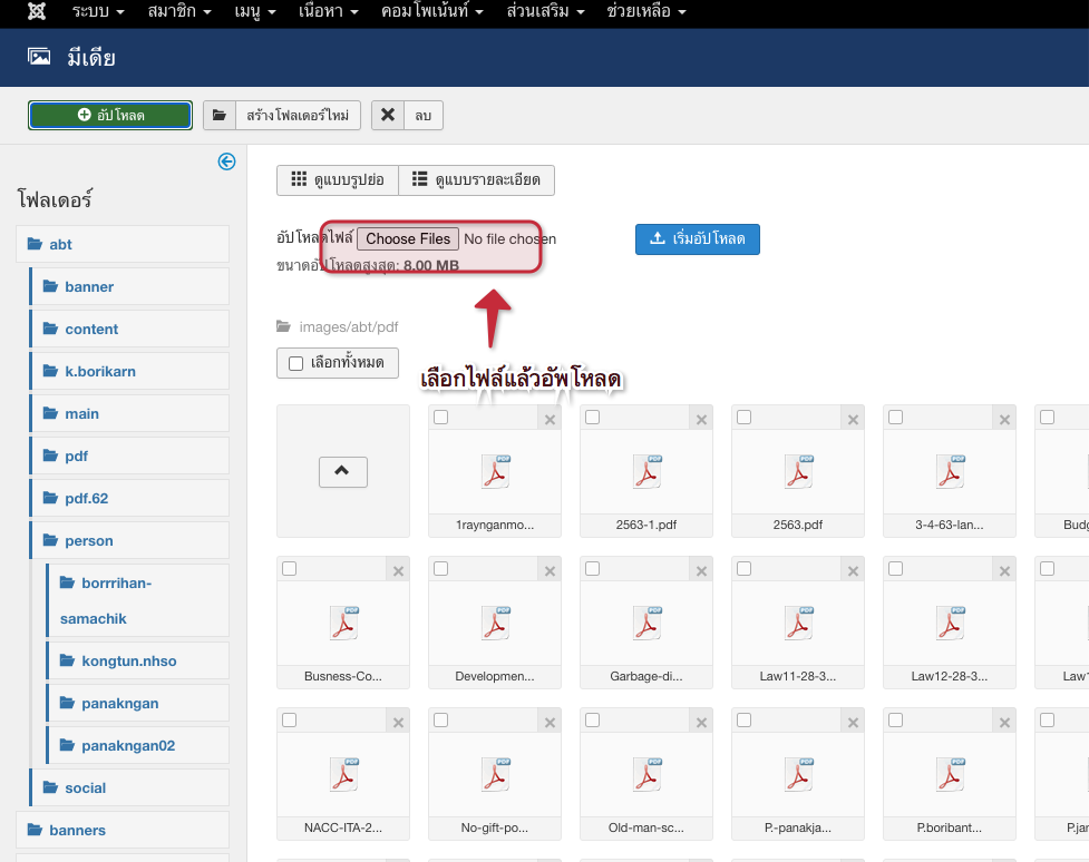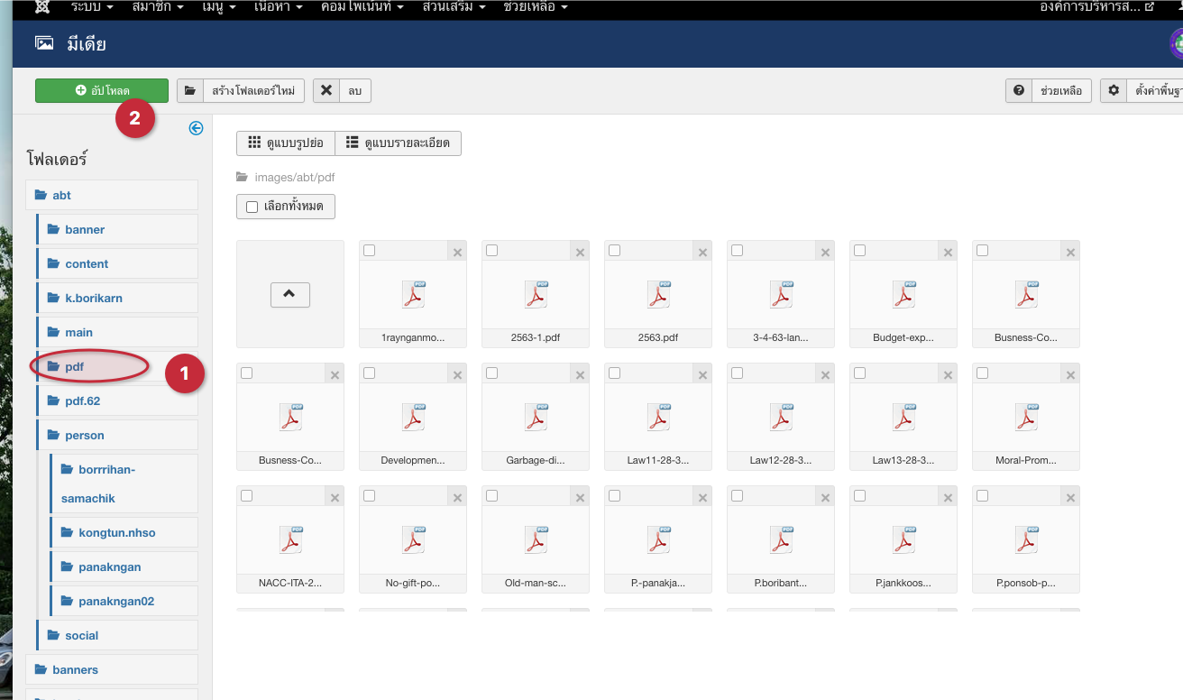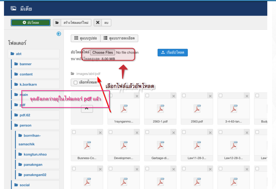 จากนั้นเลือกโฟลเดอร์ pdf จะพบ ไฟล์ pdf ให้ทำการ คลิก อัปโหลด