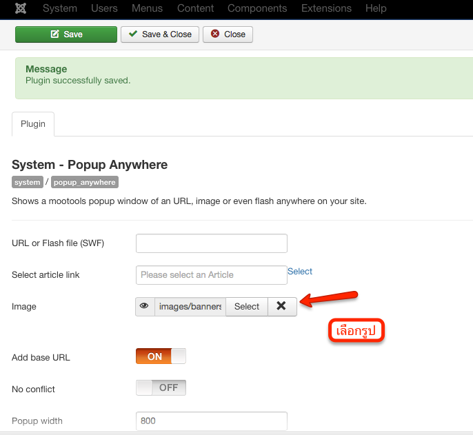 ทำการตั้งค่าก่อนใช้งานและเลือกภาพที่ต้องการ popup โดยไปที่ Plugin Manager