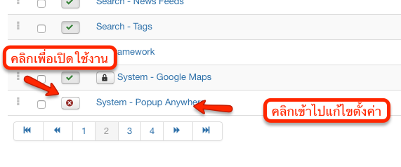 เมื่อเข้าไปแล้วจะพบ ปลักอิน ใหม่ชื่อ system - popup Anyware ให้ทำการคลิกเข้าไปแก้ไขก่อนที่จะเปิดใช้งาน เมื่อเห็นเป็นจุดสีแดงแสดงว่าปิดใช้งาน ให้คลิกเป็นเครื่องหมายถูก เช่นเดียวกันหากต้องการปิดการใช้งาน ก็ คลิกให้เป็นสีแดงตามรูป