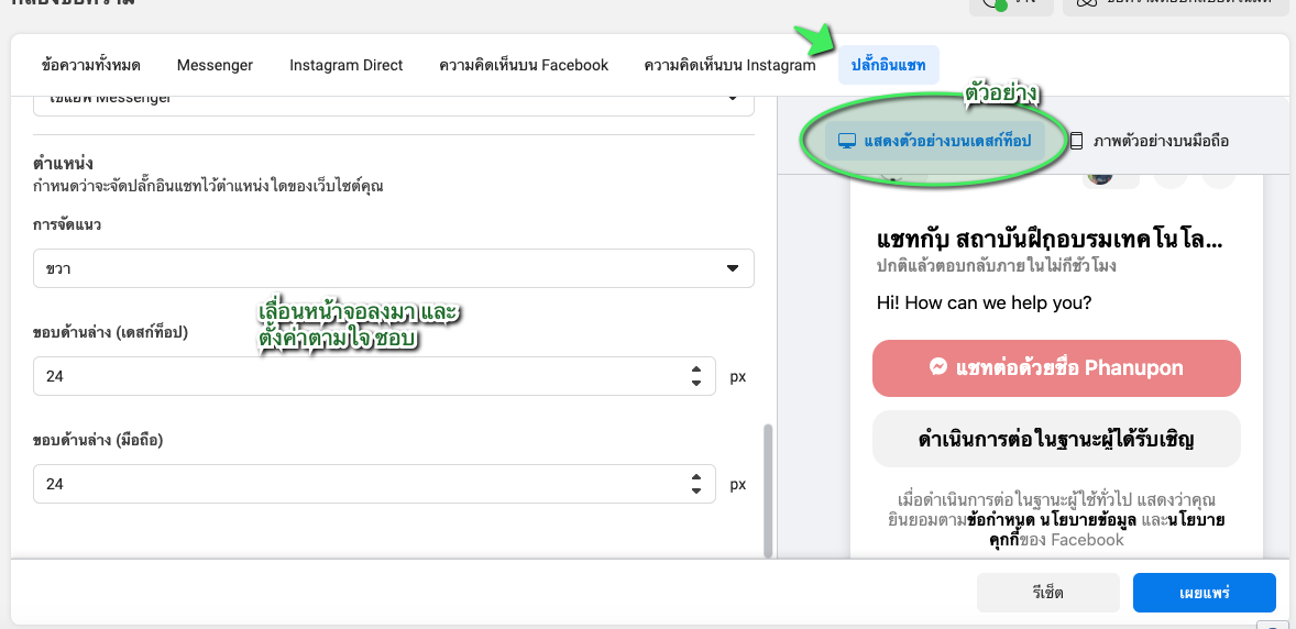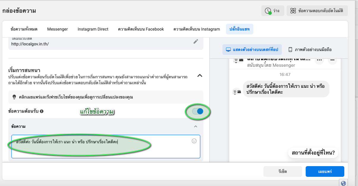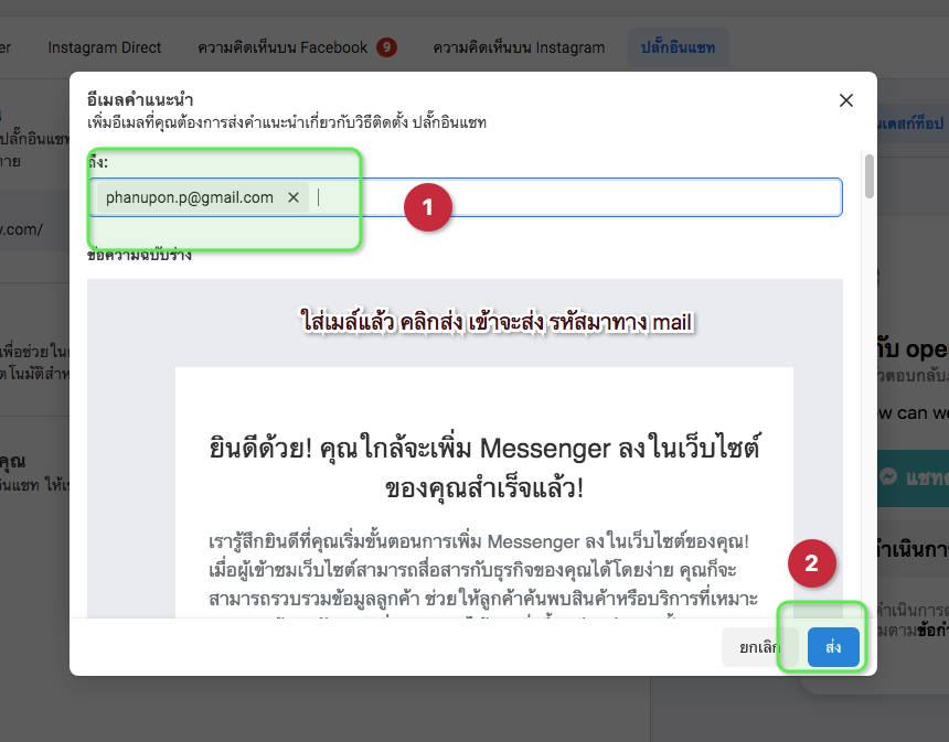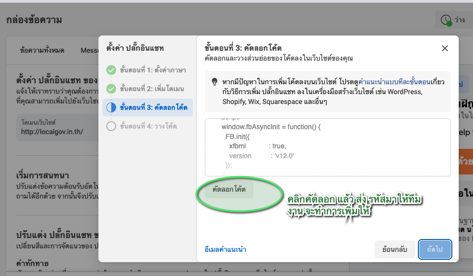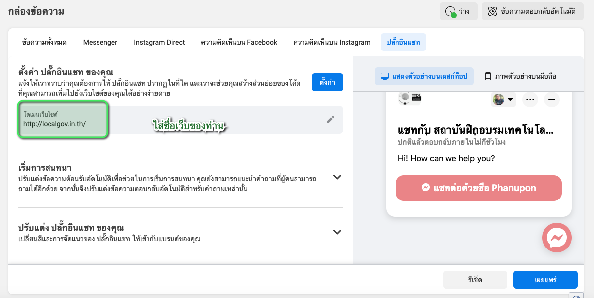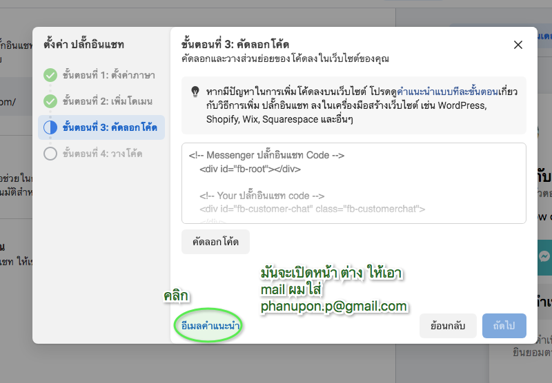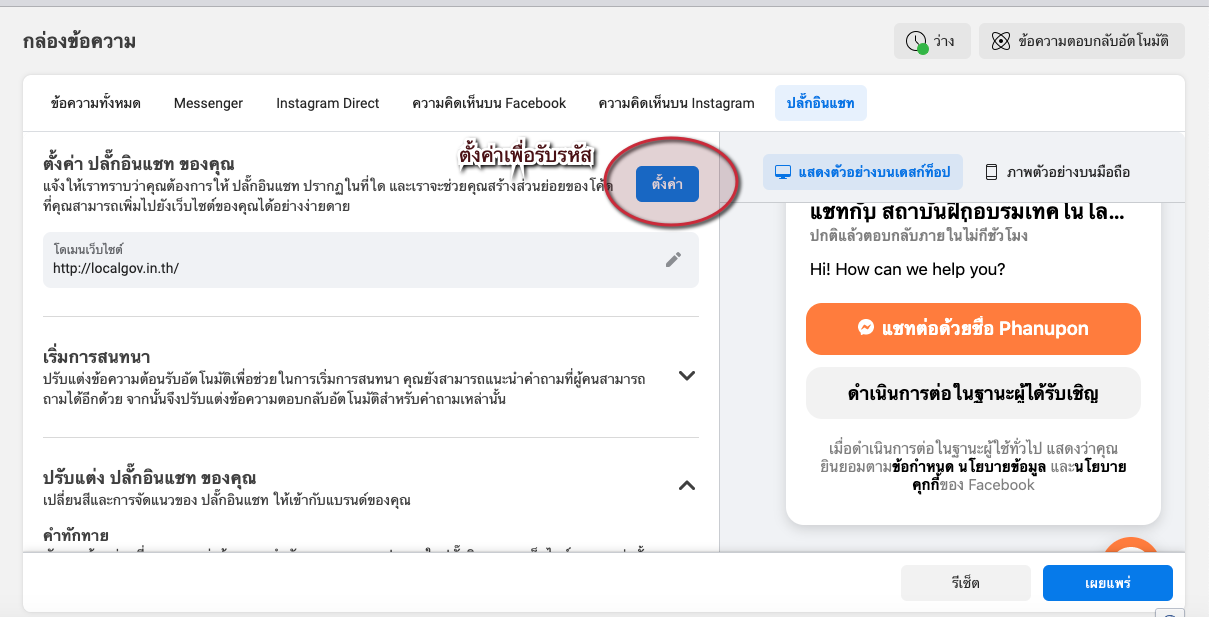 การสร้าง แชท สำหรับ ใช้บริการถามตอบ ที่หน้าเว็บไซต์ ต้องเป็น แอดมินเพจ ของ เฟสบุ๊ก ให้ทำตามขั้นตอนต่าง ๆ ตามรูป แล้ว ส่ง รหัส มาทาง ข้อความ ทางช่องทางส่วนตัว ทีมงานจะจัดทำให้