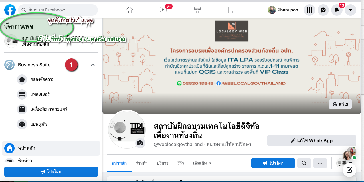 เมื่อเข้ามาในเพจของ อบต ให้สังเกตุว่าเป็นเพจจริง ๆ โดยที่ด้านบนจะเขียนว่า จัดการเพจ