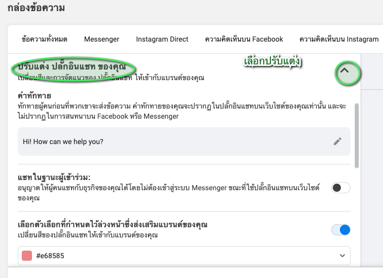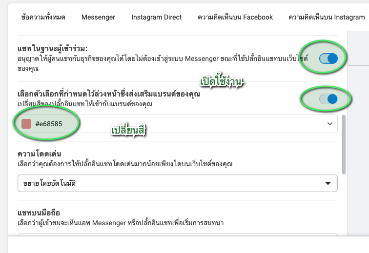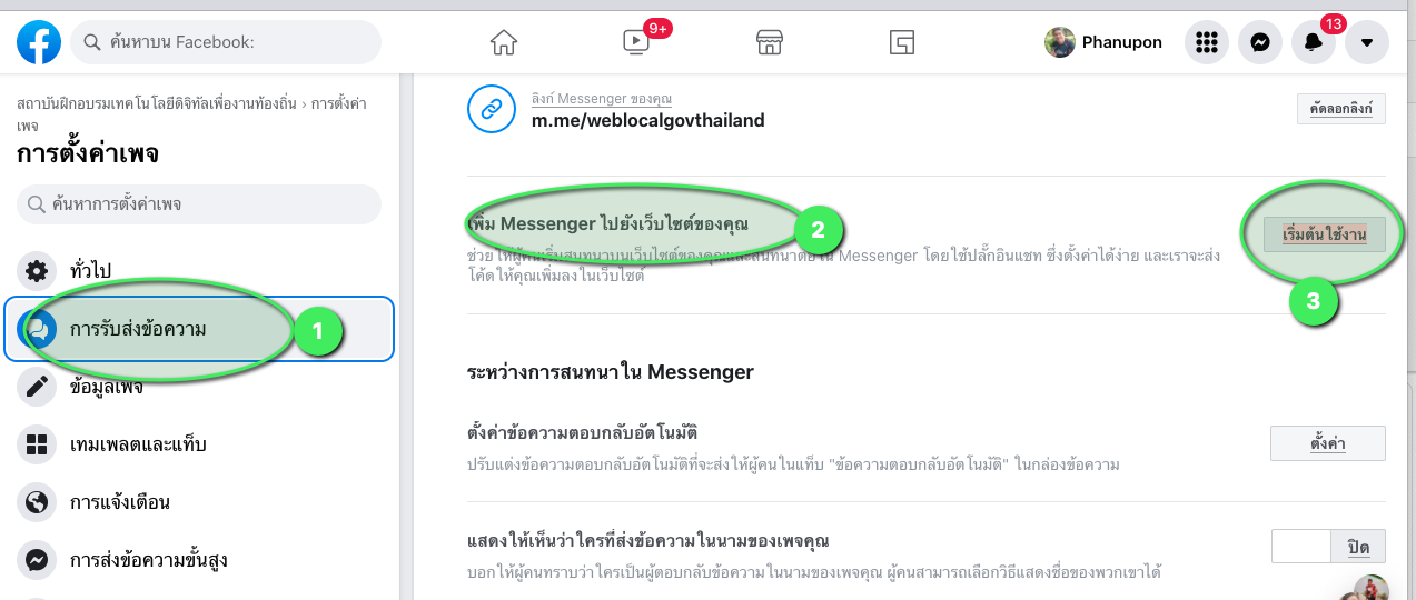 จากนั้นมาที่ การรับส่งข้อความ และ ให้มองหา เพิ่ม messenger ไปยังเว็บไซต์คุณ